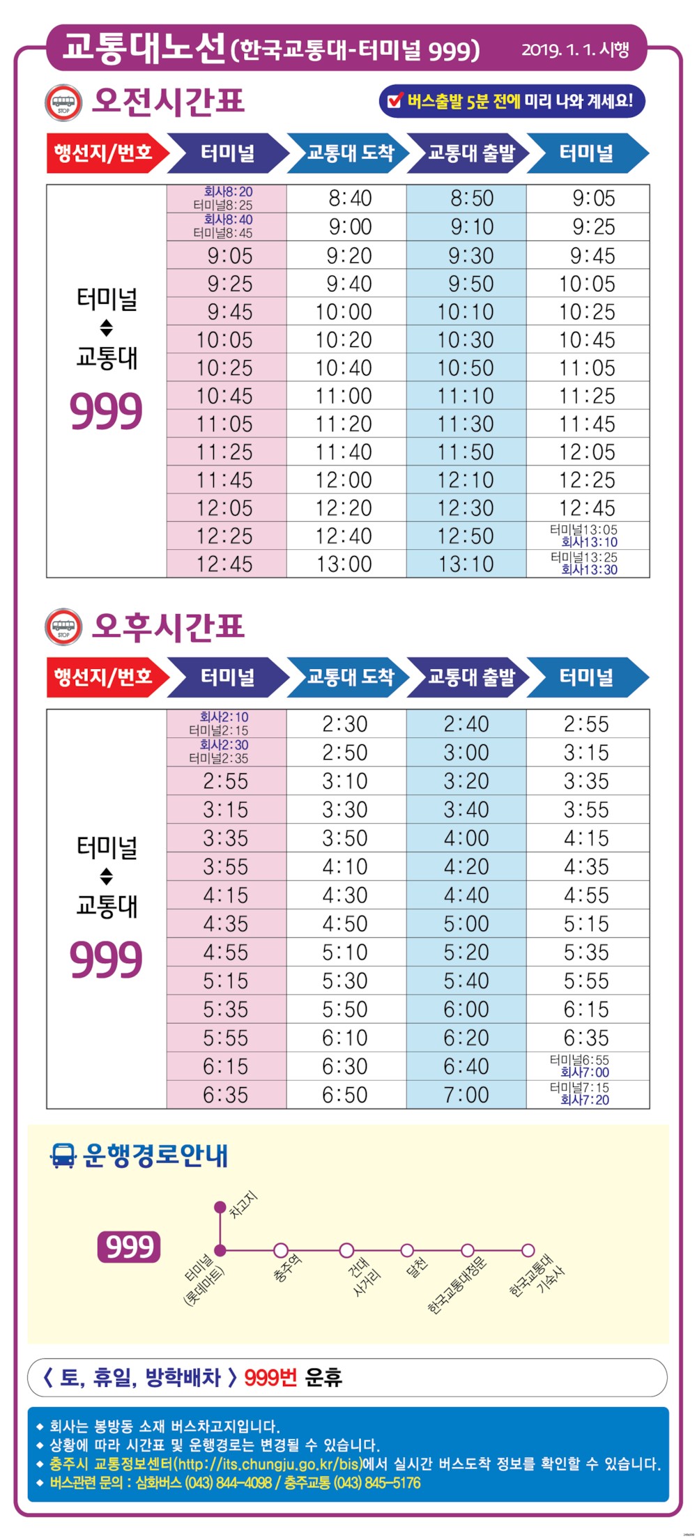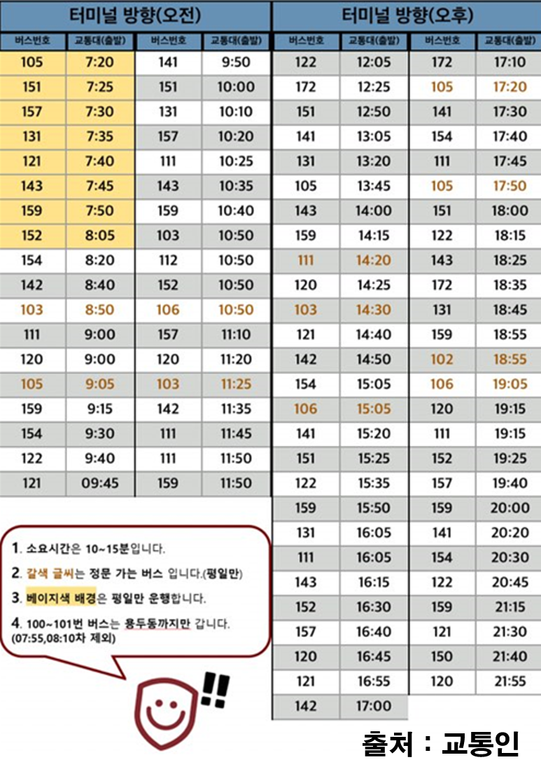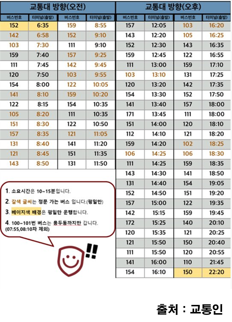 교통대에서 터미널 가는 버스 시간표입니다