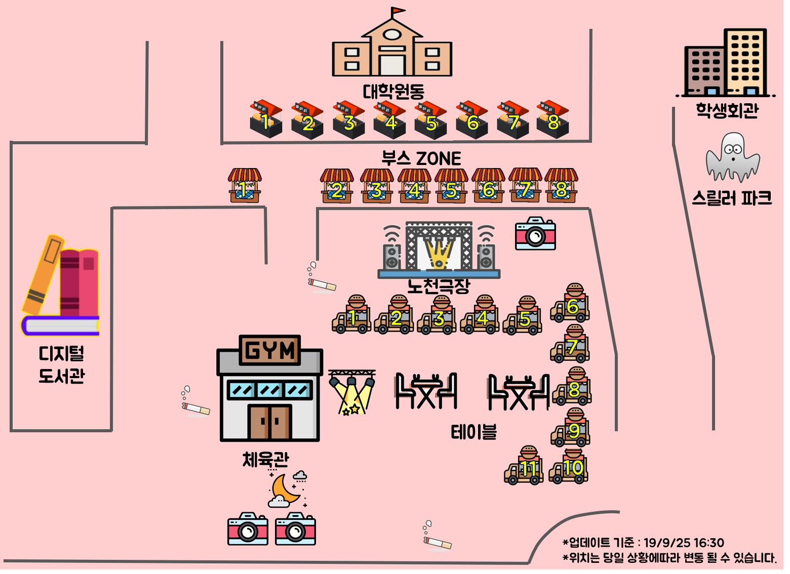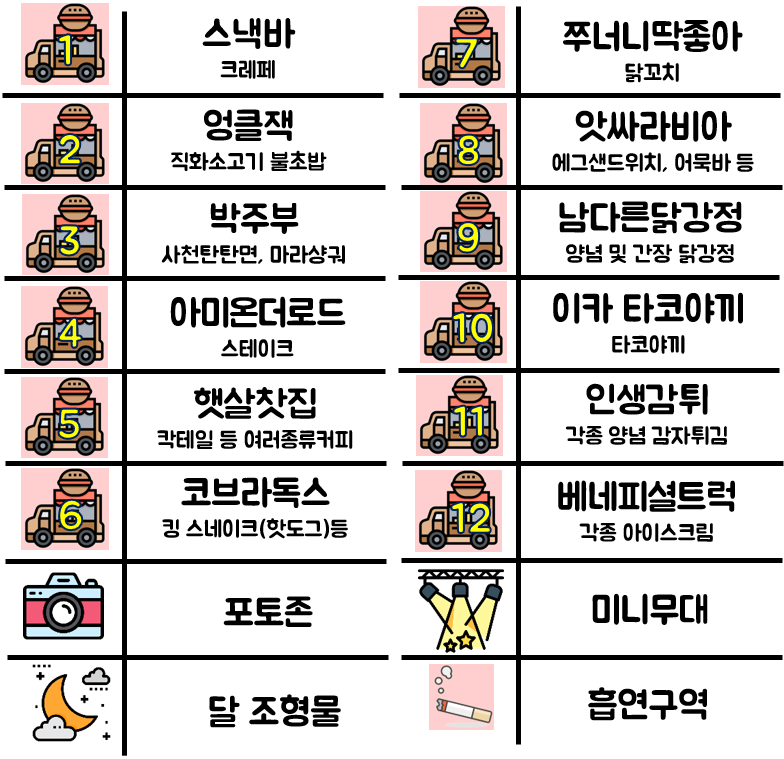 **약도와 푸드트럭 및 부스 위치는 사전에 얻은 정보를 기반으로 만들어졌습니다**